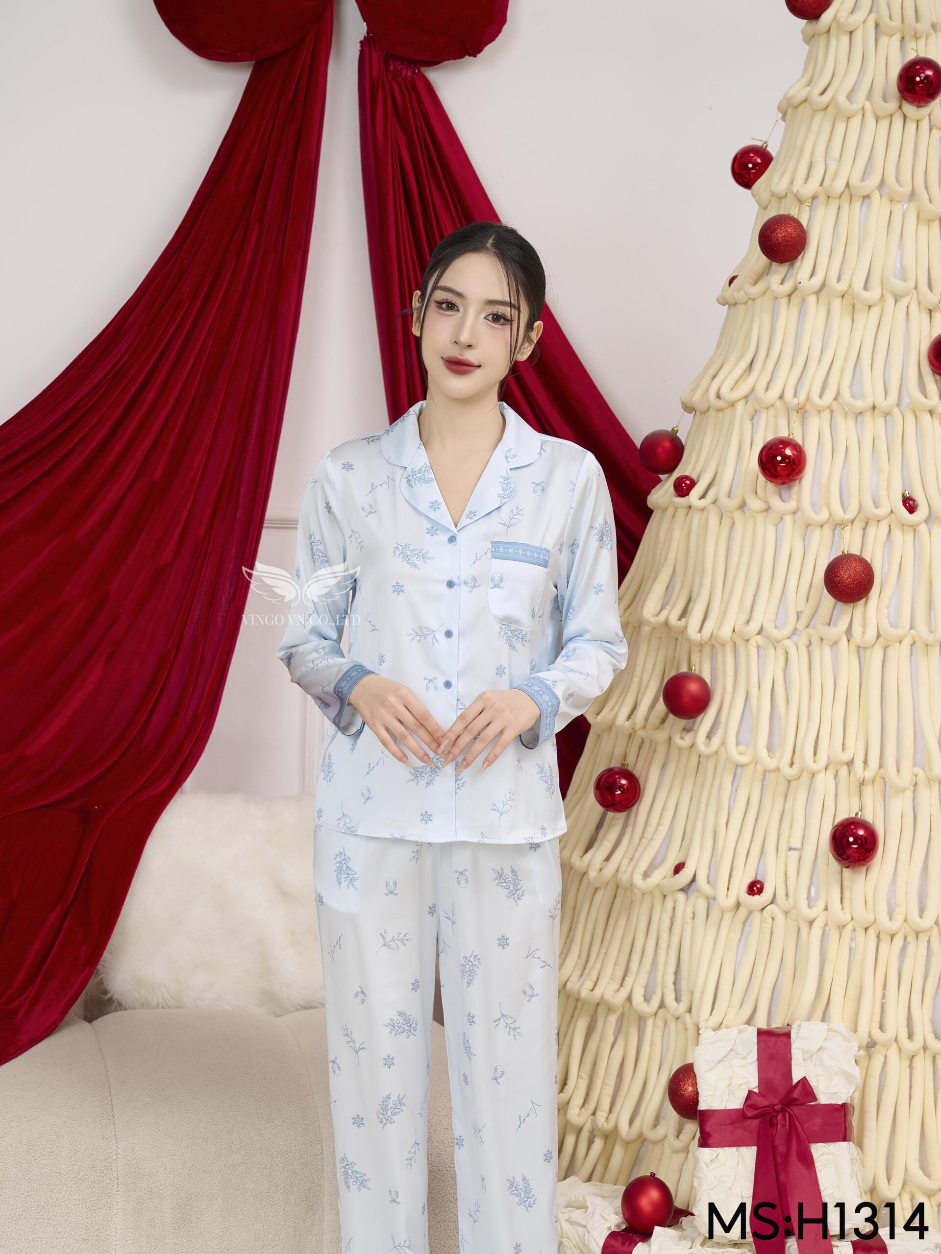 Bộ pijama lụa nữ tay dài quần dài mặc mùa thu đông họa tiết bông tuyết H1314