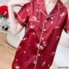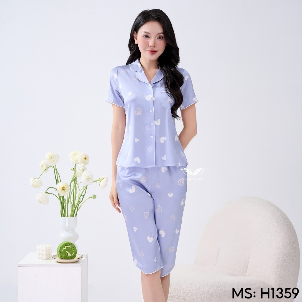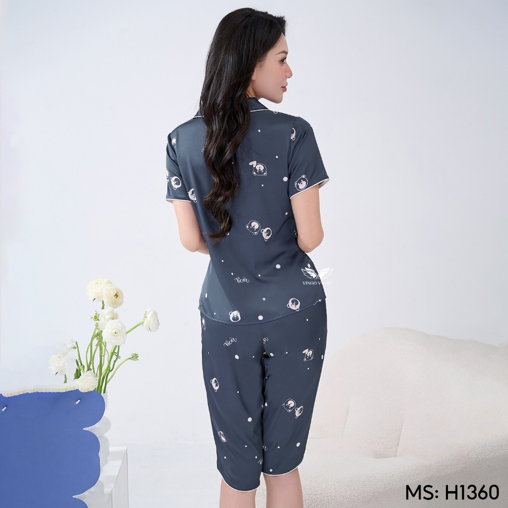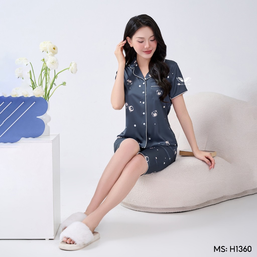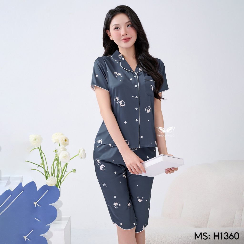 Bộ Pijama lụa tay cộc quần lửng H1360 dáng eo họa tiết gấu nhỏ H1360