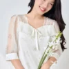 – Áo có dáng suông ngắn, phần ngực kết hợp bèo nhún tạo độ mềm mại, đi kèm chi tiết nơ nhỏ giữa ngực tăng thêm vẻ dễ thương