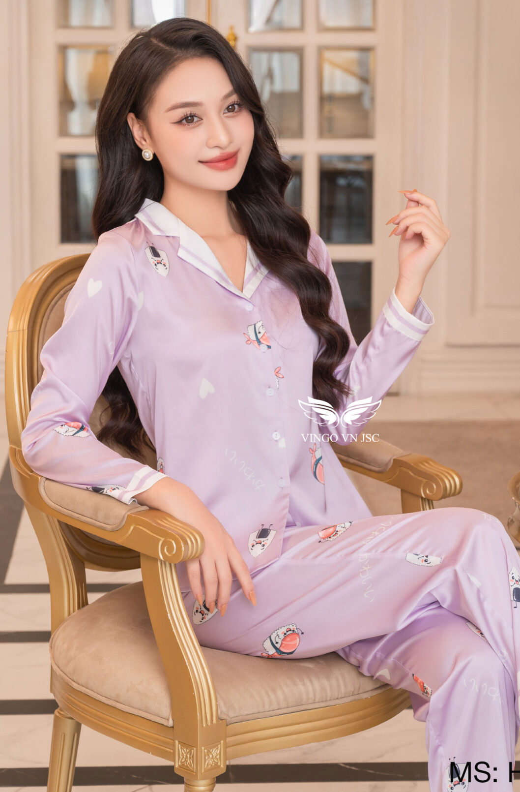 Bộ đồ ngủ pijama lụa tay dài quần dài màu tím nhạt hoạ tiết dễ thương H1087