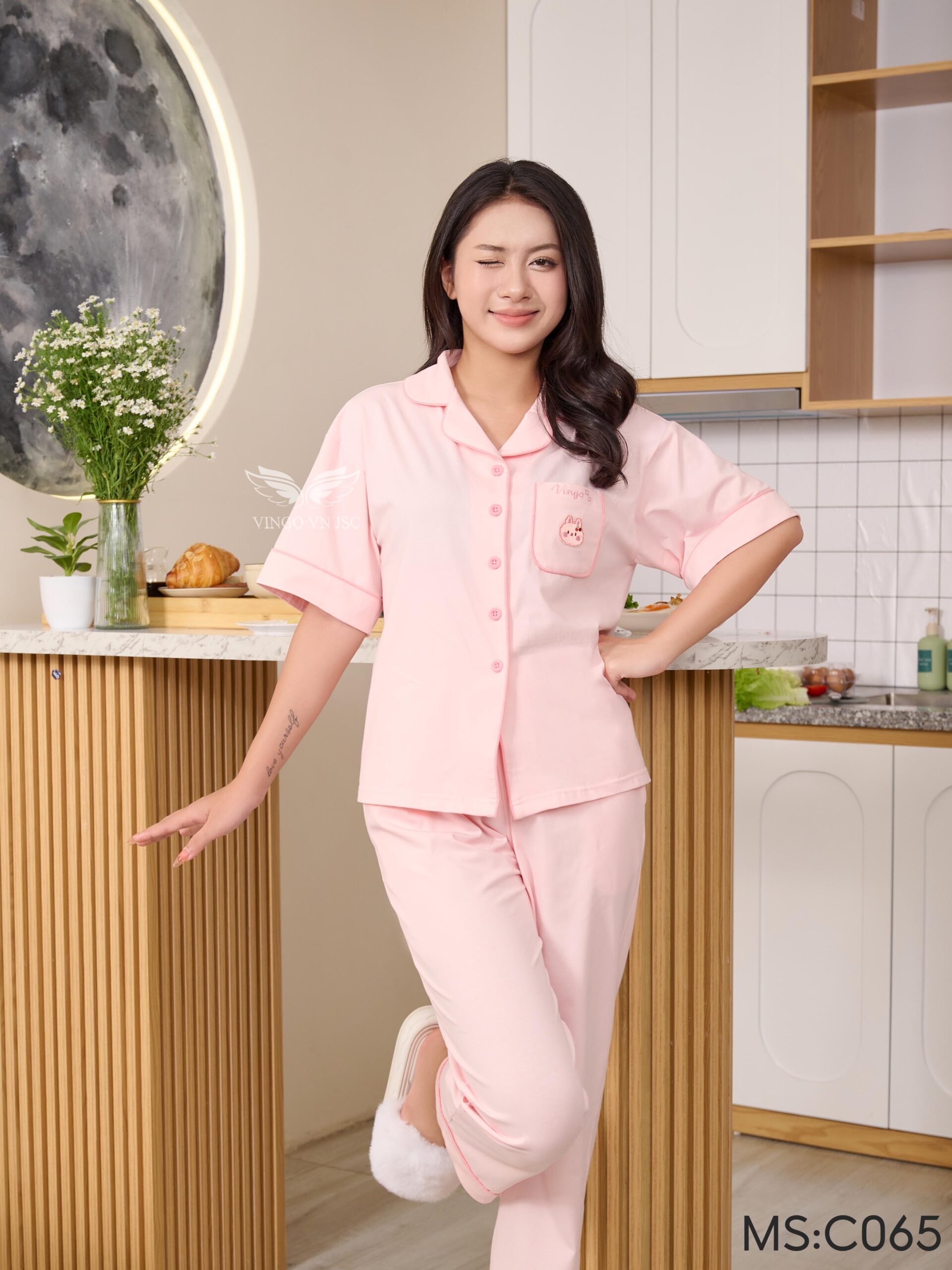 Bộ đồ ngủ mặc ở nhà cotton màu hồng dễ thương C065
