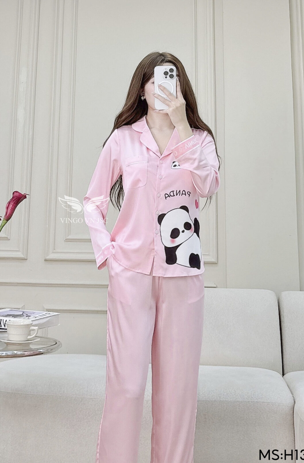 Đồ bộ mặc nhà pijama lụa cao cấp tay dài quần dài họa tiết Panda dễ thương H1300